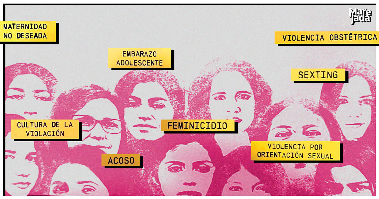 En la portada de Siempre estuve en riesgo figuran los rostros de mujeres que comparten sus historias. También están las etiquetas de los distintos tipos de violencia: obstétrica, por orientación sexual, micromachismos, cultura de la violación, embarazo adolescente, sexting…
